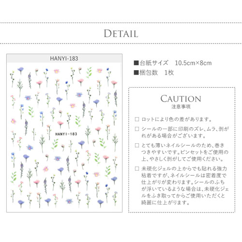 製品情報 梱包数 1枚 サイズ 台紙サイズ:10.3cm×8cm 発送方法 メール便190円/佐川急便470円(沖縄・離島以外)/ゆうパック410円〜 用途 ジェルネイル・レジン用品 オススメポイント やさしい色のフラワーネイルシール(Pastel flower) 淡いパステルカラーのフラワーネイルシールです。