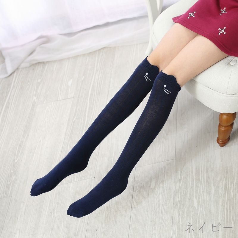 つぶらな瞳に耳付きのねこモチーフのデザインがとっても可愛い子供用ハイソックスです。